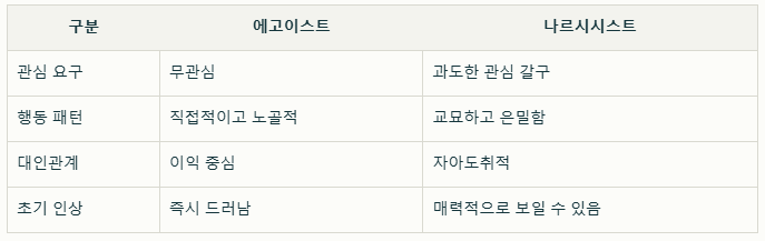 에고이스트와 나르시시스트는 종종 혼동되지만 명확한 차이가 있습니다: