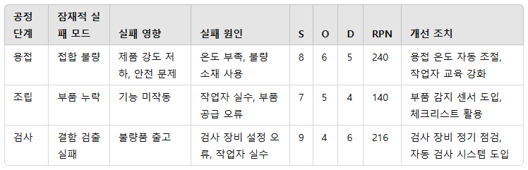 - 위험 우선순위 지수(RPN = S × O × D)를 계산하여 개선이 필요한 항목을 우선순위로 정합니다.